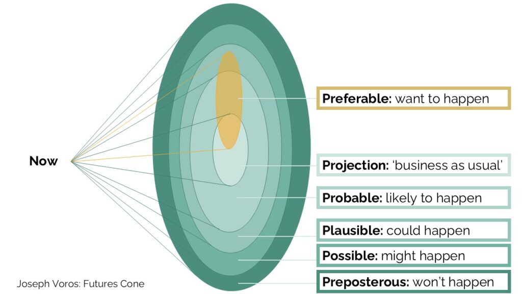 In this way they developed futures that were richer and more varied than if they had imagined them unaided, or explored each idea singly. They were engaging with the possible and the preposterous, not the preferred and the projected. But that’s not the endpoint of this activity.